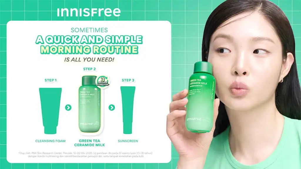 Menjawab tantangan tersebut, Innisfree memperkenalkan Green Tea Ceramide Milk Essence. Essence bertekstur susu ringan ini hadir dengan teknologi Supercharged Hydration 3 Detik, dirancang khusus untuk memberikan hidrasi instan yang cepat meresap dan tahan lama, sangat ideal untuk cuaca yang tidak menentu.